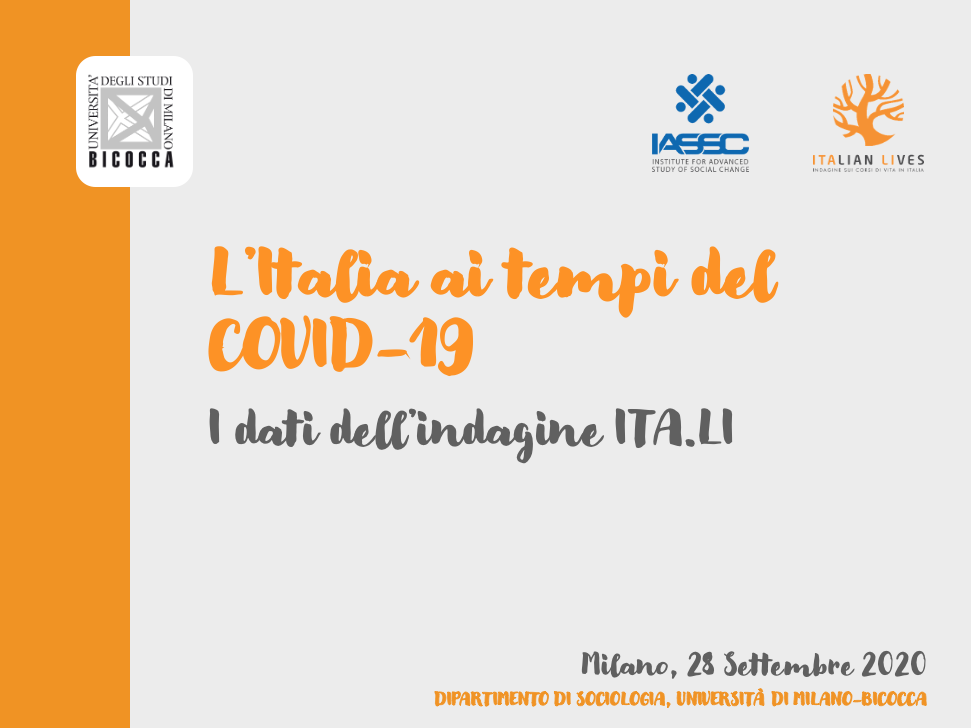 Notizie“L’Italia ai tempi del Covid-19” è il titolo di una ricerca condotta dai ricercatori IASSC (Institute for Advanced Study of Social Change), l'osservatorio permanente sul mutamento sociale del Dipartimento di Sociologia e ricerca sociale dell’Università di Milano-Bicocca. La ricerca è stata realizzata, tra aprile e agosto 2020, mediante la somministrazione di un questionario, in modalità CAWI e CATI, a 950 persone, un campione selezionato nell’ambito del progetto di ricerca “ITA.LI - Italian Lives”, l’indagine longitudinale sui corsi di vita in Italia, finanziata dal Ministero dell’Università mediante i fondi dei Dipartimenti di eccellenza. Gli intervistati hanno risposto a un breve questionario – già utilizzato, in forma simile, in Germania e Regno Unito – inteso a chiarire i cambiamenti intervenuti nei principali domini di qualità di vita (salute, lavoro, relazioni familiari e amicali, qualità della vita) a causa del Covid-19 e delle misure di contenimento del contagio.